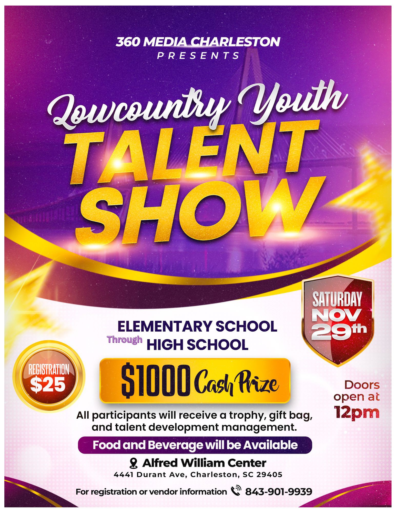 Join us for the 1st Youth Talent Show presented by 360 Media Charleston! 🎤 Open to all ages from elementary to high school. Register now for a chance to win a $1,000 cash prize and more! We're also seeking vendors of all ages. Food truck vendors as well. If you have a young entrepreneur, sign them up today! Contact us at 843-901-9939 or text "360 TALENT" to 843-964-4431 for details. We look forward to seeing you on November 29, 2025, at the Alfred Williams Center, 4441 Durant Ave, Charleston, SC!